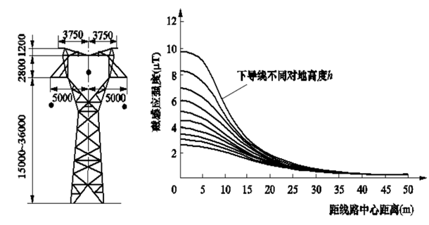 圖1列舉了220kV電壓等級,采用貓頭型鐵塔,三相單回路,導(dǎo)線呈三角型布置的輸電線路下,離地1m高度處的磁場橫向分布計算曲線。曲線以鐵塔中心線為坐標(biāo)原點(O點),顯示了磁感應(yīng)強度(磁通密度)隨距離的衰減關(guān)系。該圖曲線對應(yīng)的計算線路電流為300A(采用LGJ—300鋼芯鋁絞線),圖中曲線自上至下對應(yīng)導(dǎo)線對地計算高度h分別為8、9、10、11、12、13、14、15、16、17m。