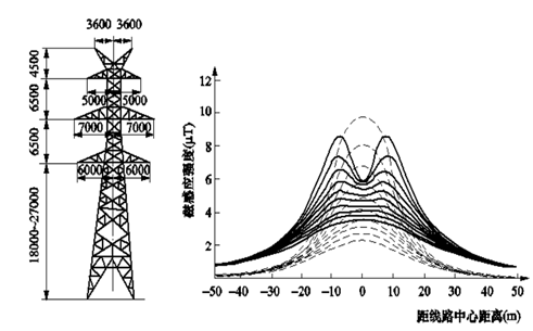 應(yīng)注意到,線路周圍空間的工頻磁感應(yīng)強度與線路電流成正比。隨著單回線路輸電容量的增大,500kV同塔多回輸電線路已采用分裂數(shù)更多、截面更大的導(dǎo)線(如6×630mm2導(dǎo)線),每回線路電流可高達2000~3000A。此時,線路下方工頻磁感應(yīng)強度*大值可能高達20~30μT。但即使對多分裂、大截面、走廊內(nèi)線路高度密集的同塔多回路輸電線路,其下方的工頻磁感應(yīng)強度*大值仍遠低于環(huán)境影響評價標(biāo)準(zhǔn)限值(100μT)。由圖1、圖2計算實例可見,在距線路中心50~100m以上距離處,來自電力線路的工頻磁場水平已與當(dāng)?shù)厣瞽h(huán)境中的背景水平相當(dāng)。